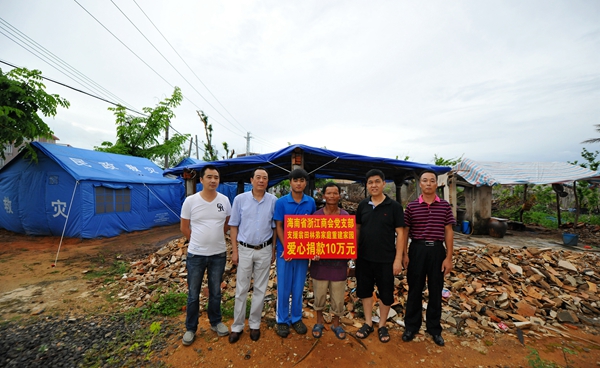 為臺風受災(zāi)戶建一套房子,這是商會黨支部做出的一項決定。為此,黨支部連續(xù)2次在黨員中號召為災(zāi)區(qū)捐款,共捐款10萬元。黨支部派專人到臺風最嚴重的翁田鎮(zhèn)聯(lián)系,到災(zāi)民家查看,山里村低保戶林召江家住了30多年的房子全部刮倒,夷為平地,這家非常困難,林召江在鎮(zhèn)上打零工,妻子是精神病患者,大兒子今年剛考上大學,二兒子有病不能自理,如今全家住在救災(zāi)的帳篷里。27日下午,黨支部書記潘樟云、副書記印可平一行5人來到文昌市翁田鎮(zhèn)山里村,舉行了捐贈儀式,翁田鎮(zhèn)鎮(zhèn)長周安偉作為監(jiān)證方代表參加了捐贈活動,并且在捐贈協(xié)議書上簽了字。根據(jù)協(xié)議,這筆款必須用于建房,面積100平方米,根據(jù)工程進度分3次付清,首筆3萬元現(xiàn)金已經(jīng)送到林召江手中。
