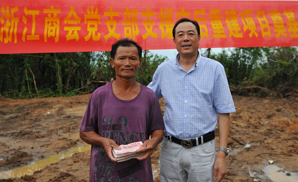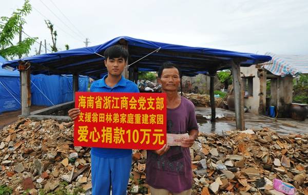 8月27日,這次臺風的重災(zāi)區(qū)文昌市山里村出現(xiàn)了一個感人的場面,海南省浙江商會黨支部捐贈該村村民林召江家10萬元,用于這家的災(zāi)后重建。林召江從商會黨支部書記潘樟云手里接過現(xiàn)金,感動的說不出話來。