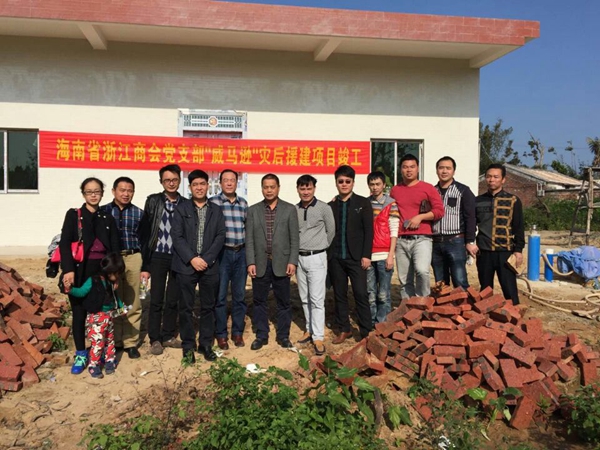 浙江商會(huì)黨支部從成立至今始終把公益事業(yè)放在首位,每年組織黨員、入黨積極分子進(jìn)行捐款活動(dòng)。今年“威馬遜”特大臺(tái)風(fēng)給海南造成重創(chuàng),尤其是文昌受害最為嚴(yán)重。黨支部從臺(tái)風(fēng)當(dāng)天開(kāi)始,積極組織發(fā)動(dòng)大家捐款。這次為臺(tái)風(fēng)共30人次捐款46900元。6月28日黨支部活動(dòng)捐款47人次77200元。兩次共捐款124100元。經(jīng)過(guò)支部認(rèn)真討論,決定對(duì)南國(guó)都市報(bào)報(bào)道的文昌翁田低保戶林召江家庭進(jìn)行重點(diǎn)幫助。支部派人實(shí)地考察,決定為林召江家庭援建住房100平方,捐款10萬(wàn)元用于災(zāi)后房屋重建。經(jīng)過(guò)不到半年時(shí)間,該項(xiàng)目已于2014年12月30日前完工。2015年1月3日,黨支部組織黨員15人前去文昌翁田對(duì)援建項(xiàng)目進(jìn)行驗(yàn)收,并舉行了簡(jiǎn)單的交接儀式。