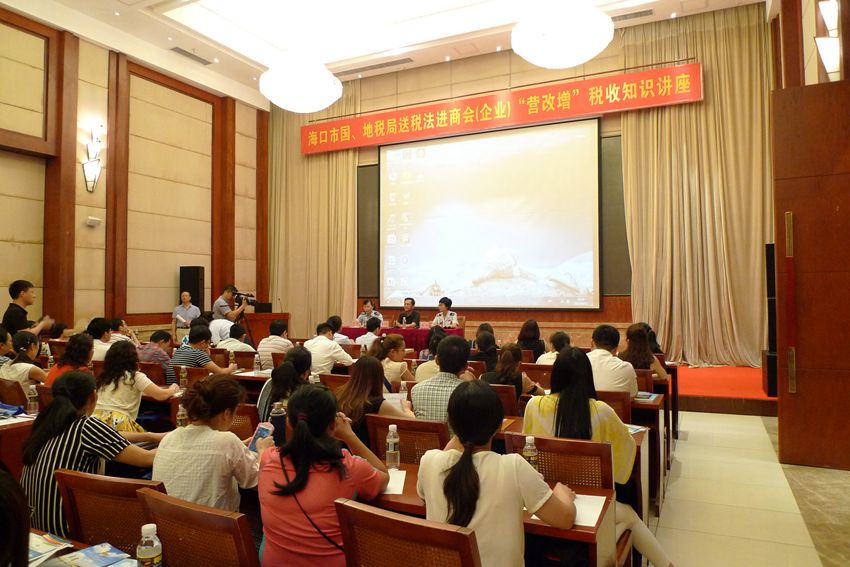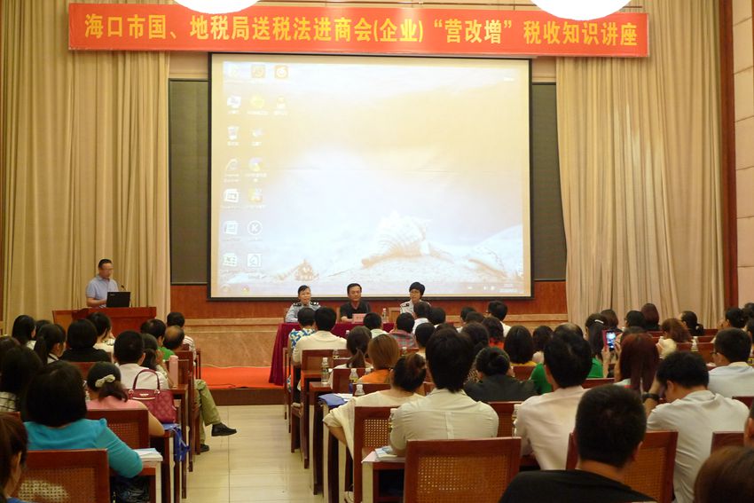 根據(jù)國家稅務(wù)總局營改增工作部署,2016年5月1日起,建筑業(yè)、房地產(chǎn)業(yè)、金融業(yè)和生活性服務(wù)業(yè)將全部一次性納入營改增試點(diǎn)范圍,全面完成營改增改革。我商會會員企業(yè)中,從事房地產(chǎn)業(yè)、建筑業(yè)和服務(wù)業(yè)的企業(yè)不在少數(shù),為盡快幫助會員企業(yè)了解“營改增”過渡時期的注意事項(xiàng),確保會員企業(yè)把握好稅收政策,實(shí)現(xiàn)“營改增”的平穩(wěn)過渡,4月13日下午,我商會聯(lián)合海南省江蘇商會,海南省上海商會,邀請海口市國稅局和海口市地稅局的業(yè)務(wù)骨干,給我三家商會涉及此次稅改的會員企業(yè),舉辦了一場專題講座,主要從政策方面,給大家進(jìn)行了培訓(xùn)和解讀。三家商會的70多家會員企業(yè)共150多人參加了講座。