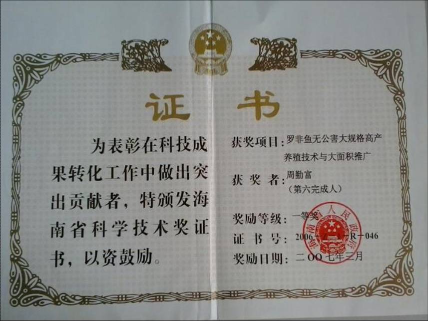 經(jīng)過(guò)多年的努力奮斗,2007年,周勤富獲得海南省人民政府頒發(fā)的羅非魚(yú)養(yǎng)殖與推廣技術(shù)科技一等獎(jiǎng);2010年海南勤富食品公司被評(píng)為“全國(guó)最具影響力的羅非魚(yú)企業(yè)”;2012年“勤富”商標(biāo)獲得海南省著名商標(biāo),勤富牌羅非魚(yú)產(chǎn)品被評(píng)為海南省名牌產(chǎn)品;2013年獲得國(guó)家商務(wù)部和國(guó)資委授予的“AAA 級(jí)信用企業(yè)”;2014-2018年勤富公司連續(xù)三屆被省總工會(huì)評(píng)為第七、八、九屆海南省優(yōu)秀民營(yíng)企業(yè),周勤富本人連續(xù)三屆被評(píng)為優(yōu)秀企業(yè)家。勤富公司自有的養(yǎng)殖基地先后分別被農(nóng)業(yè)部評(píng)為“無(wú)公害養(yǎng)殖示范區(qū)”、被國(guó)家質(zhì)量監(jiān)督局認(rèn)定為“國(guó)家級(jí)羅非魚(yú)養(yǎng)殖標(biāo)準(zhǔn)化示范區(qū)”,通過(guò)國(guó)家良好農(nóng)業(yè)規(guī)范(GAP)認(rèn)證,“最佳水產(chǎn)養(yǎng)殖規(guī)范BAP認(rèn)證”、“歐洲水產(chǎn)養(yǎng)殖ASC認(rèn)證”。湖山基地被國(guó)家質(zhì)監(jiān)總局批準(zhǔn)為全國(guó)90個(gè)“國(guó)家級(jí)出口食品農(nóng)產(chǎn)品質(zhì)量安全示范區(qū)”之一。是海南省唯一的國(guó)家級(jí)出口食品安全示范區(qū)。同時(shí),湖山養(yǎng)殖基地還被國(guó)家標(biāo)準(zhǔn)化管理委員會(huì)授予“國(guó)家級(jí)羅非魚(yú)養(yǎng)殖標(biāo)準(zhǔn)化優(yōu)秀示范區(qū)”;錦山羅非魚(yú)養(yǎng)殖基地被海南省人民政府評(píng)為“省級(jí)現(xiàn)代農(nóng)業(yè)示范基地”;被中國(guó)水產(chǎn)流通與加工協(xié)會(huì)評(píng)為“中國(guó)羅非魚(yú)十大養(yǎng)殖基地”之首;2014年勤富食品公司被國(guó)家八大部委聯(lián)合認(rèn)定為國(guó)家農(nóng)業(yè)產(chǎn)業(yè)化重點(diǎn)龍頭企業(yè);2015年被評(píng)為中國(guó)質(zhì)量誠(chéng)信企業(yè),同年被中華全國(guó)總工會(huì)授予“工人先鋒號(hào)”榮譽(yù);2016年獲“最具影響力水產(chǎn)品企業(yè)品牌”稱(chēng)號(hào)。2017年獲“海南省誠(chéng)信示范企業(yè)”稱(chēng)號(hào)。2018年,勤富公司以良好的養(yǎng)殖條件和管理優(yōu)勢(shì),全力配合省水產(chǎn)流通與加工協(xié)會(huì)成功申報(bào)了“海南羅非魚(yú)地理標(biāo)志”,為全省羅非魚(yú)產(chǎn)業(yè)的快速發(fā)展創(chuàng)造條件。