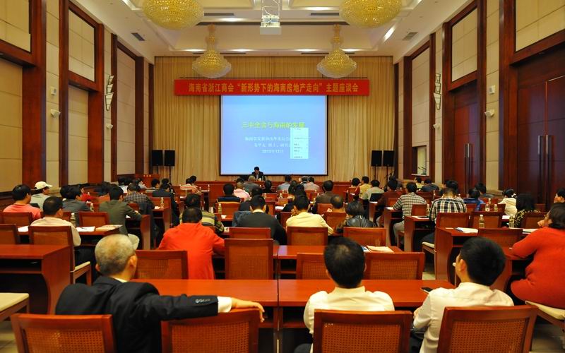 十八屆三中全會的勝利召開拉開了新一輪經(jīng)濟(jì)改革序幕,全會后土地改革、城鎮(zhèn)化建設(shè)、房產(chǎn)稅等方面改革的力度有多大?真正的房地產(chǎn)調(diào)控長效機(jī)制能否形成方案?房地產(chǎn)該如何“定調(diào)”?為幫助商會房地產(chǎn)會員企業(yè)“答疑解惑”,并共同探討海南房地產(chǎn)今后的走向, 12月6日,商會在海口攬海大酒店召開“新形勢下的海南房地產(chǎn)走向”主題座談會,會議邀請海南省發(fā)改委副主任、研究員朱華友為會員企業(yè)深入解讀全會精神和海南房地產(chǎn)發(fā)展新趨勢。會議由蔡衛(wèi)華會長主持, 70多位在瓊投資建設(shè)的浙商代表參加了座談。